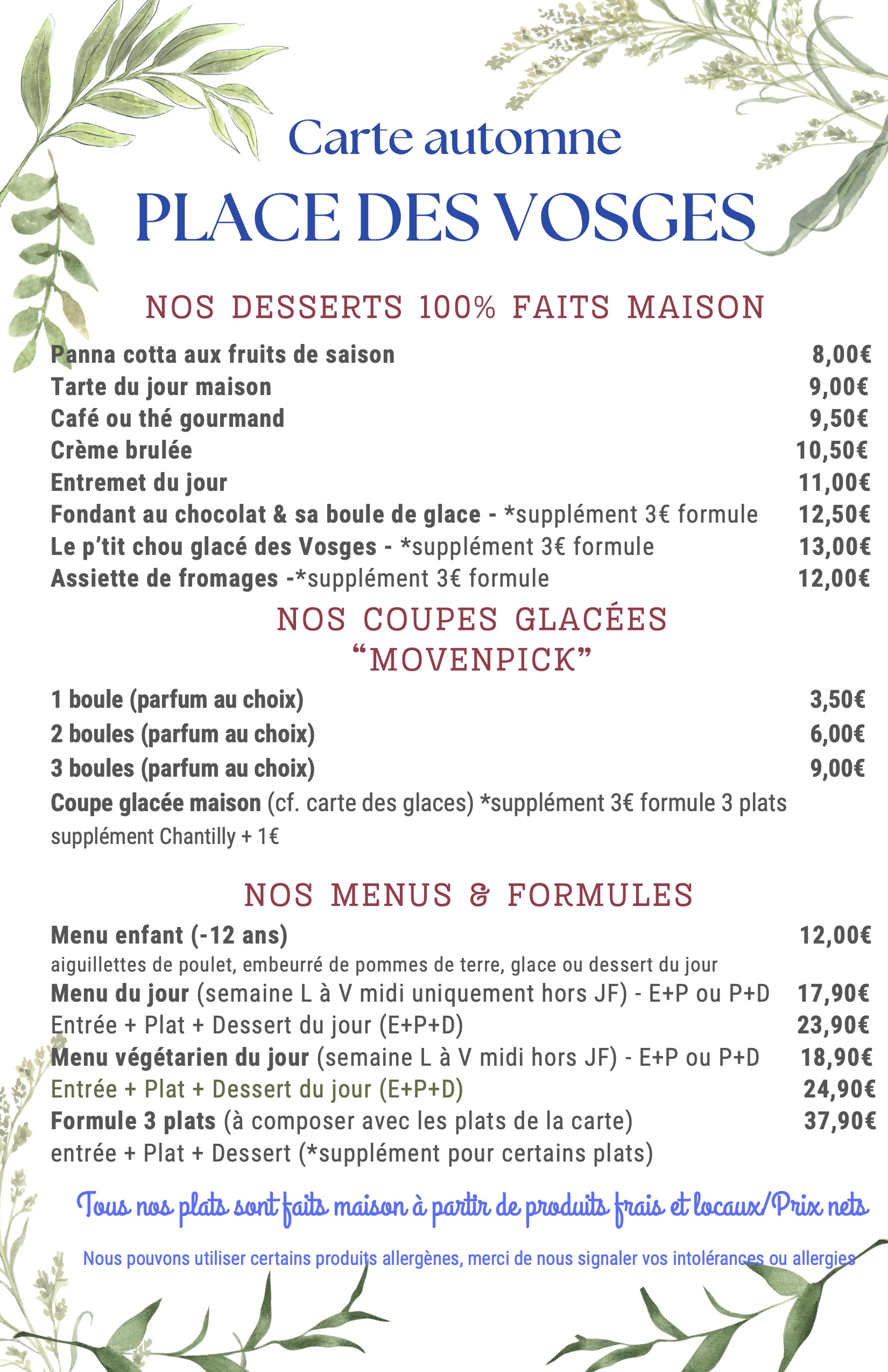 Ouvert en mai 2024, Place des Vosges est le projet d'Ingrid et Philippe, originaire de Gerardmer. Nous avons voulu créer un restaurant - Salon de thé ou l'on aime se retrouver, pour un moment gourmand, frais, maison et au maximum local. L'ambiance est joyeuse, coloré comme nous et notre cuisine.